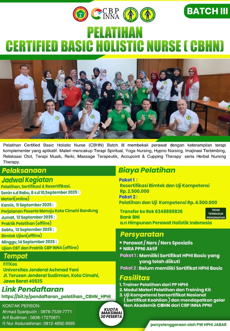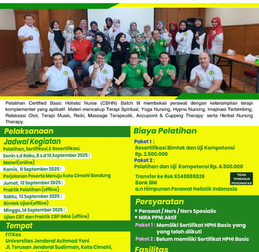 Di era pelayanan kesehatan modern, perawat dituntut tidak hanya terampil secara klinis, tetapi juga memiliki kompetensi holistik mampu melihat pasien sebagai satu kesatuan utuh: tubuh, pikiran, dan jiwa. Sertifikasi CBHN (Certified Basic Holistic Nurse) menjadi bukti kompetensi profesional yang diakui secara nasional di bawah PPNI.